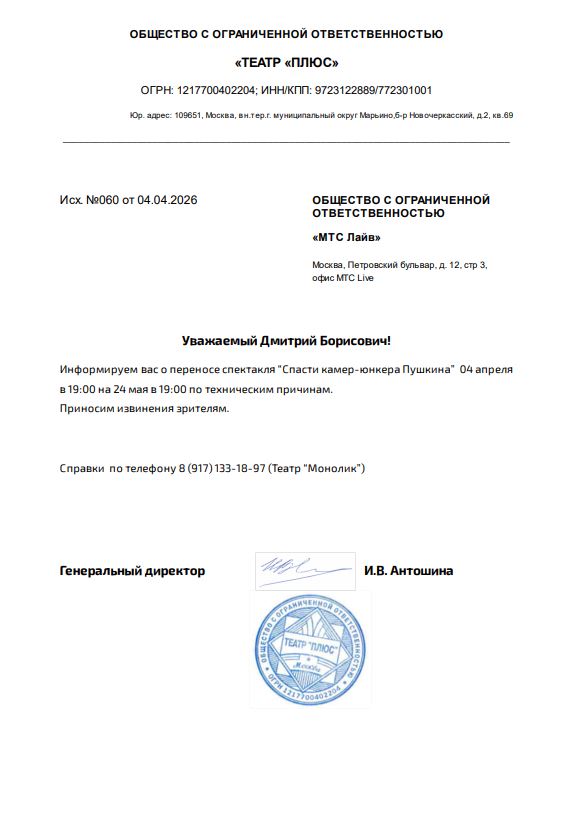 Уважаемый клиент! Спешим сообщить, что по информации, полученной от организатора, спектакль «Дядя Ваня», запланированный на 2 апреля 2026 года в Драматическом театре на Васильевском, заменен на спектакль «Спасти камер-юнкера Пушкина». Ранее приобретенные билеты действительны на новое мероприятие, обменивать их не нужно. Если вам не удобно посетить новое мероприятие, вы можете вернуть билет по кнопке в личном кабинете во вкладке «Заказы». Деньги за электронные билеты вернутся автоматически в полном объёме на карту, с которой была произведена оплата. Если вы купили билет в кассе Ticketland.ru за наличный расчет или оплатили подарочной картой, то обратитесь, пожалуйста, на почту: vozvrat@ticketland.ru. С уважением, команда поддержки Ticketland.